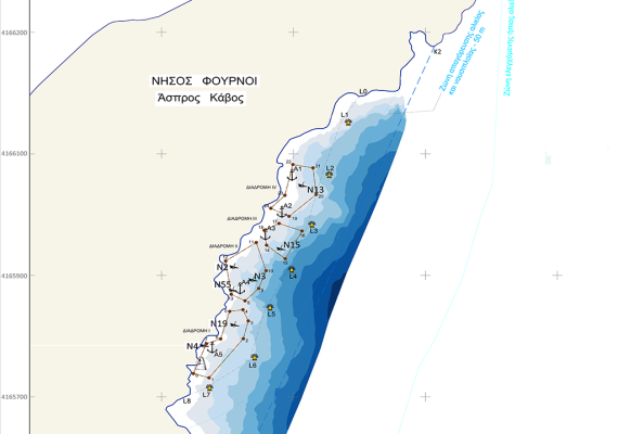 Aspros Kavos system consists of NOUS submarine units fully equipped with cameras and windshield wipers fitted to the camera lenses. The underwater operation is controlled by multitasking computing units. Extending to a submarine hub, the network of underwater cameras is powered by long cable and fiber optics reaching to the shore, connected to a purpose-built solar power station.